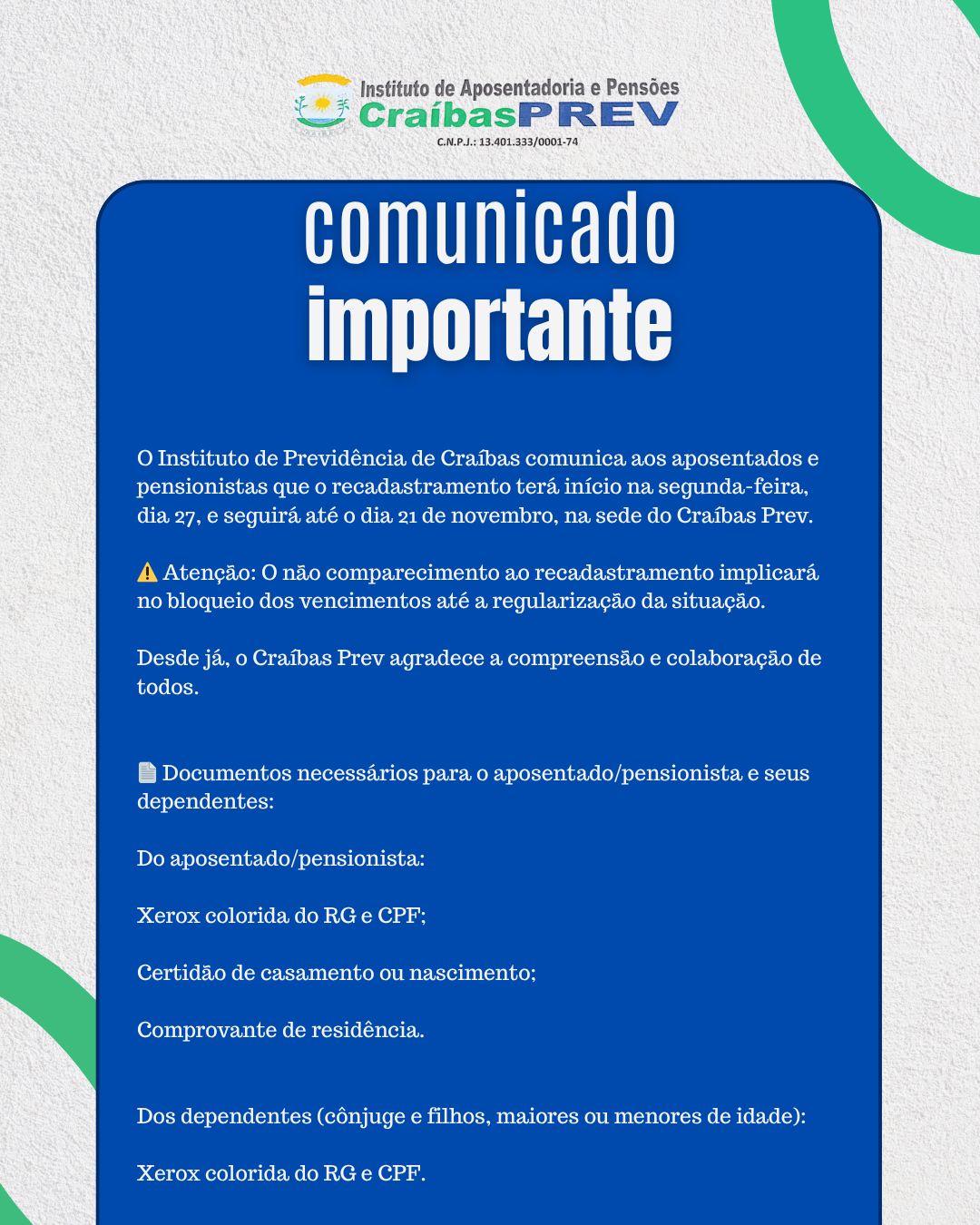 O Instituto de Previdência de Craíbas comunica aos aposentados e pensionistas que o recadastramento terá inicío na segunda-feira, dia 27 de outubro, e seguirá até o dia 21 de novembro, na sede do Craíbas Prev.